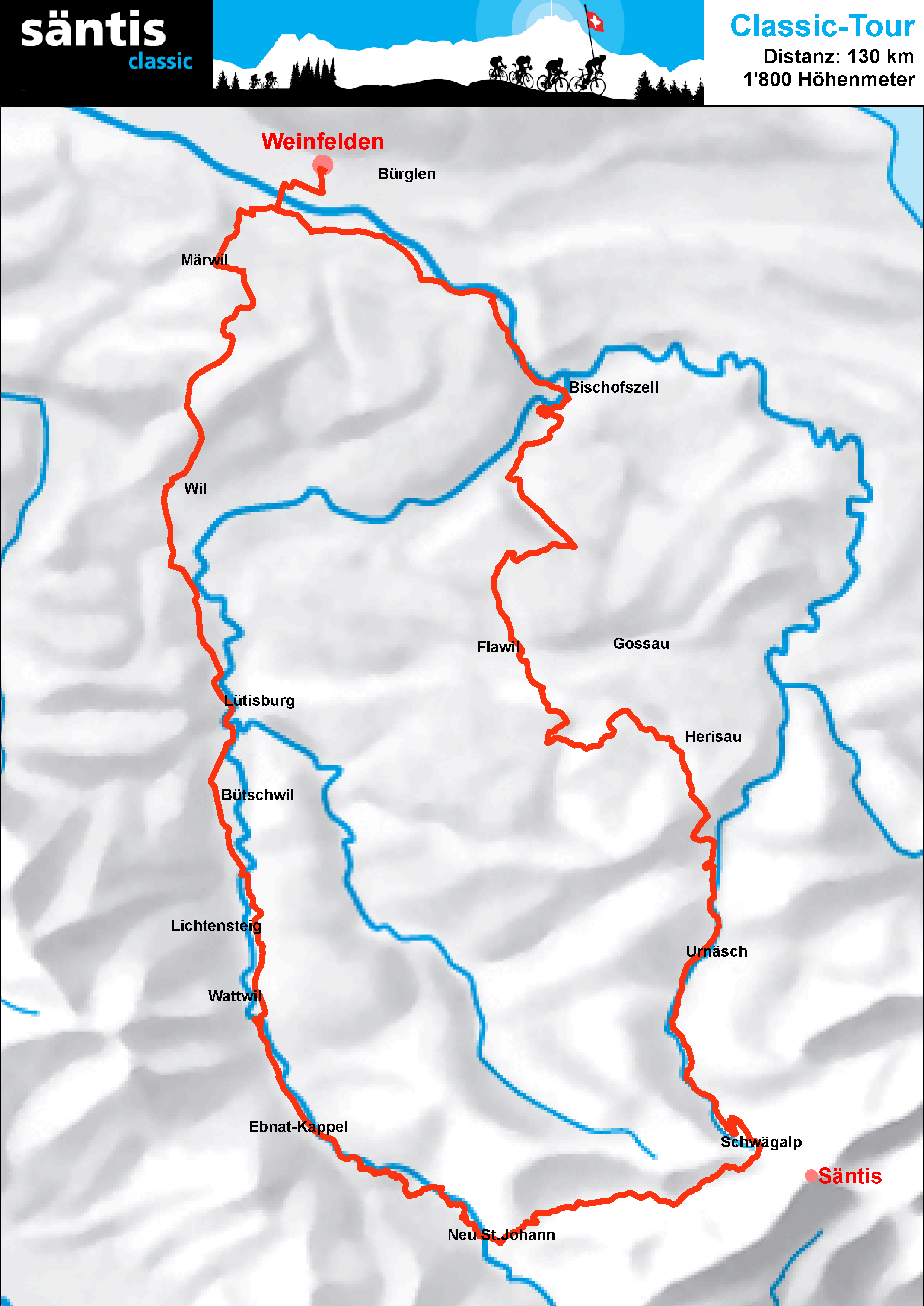 Streckendistanz 130 km mit 1‘800 Höhenmeter auf verkehrsruhigen, sicheren Strassen.