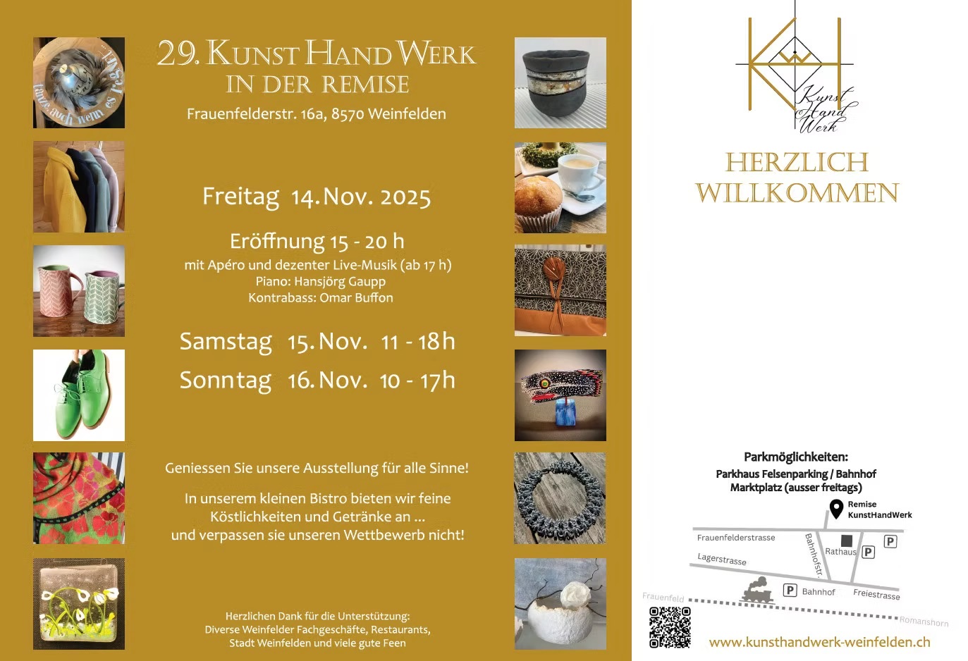 Das Verweilen im gemütlichen Bistro bei auserlesenen Häppchen und einem Drink – ein Austausch auf dem Dachboden, bevor man sich dies und jenes an der kleinen Ausstellung nochmals anschaut. Die Ausstellenden freuen sich auf interessante Begegnungen, gute Gespräche und nicht zuletzt auch auf deinen Einkauf. Nimm auch am Wettbewerb teil! Es winken Kunsthandwerk-Einkaufsgutscheine.
