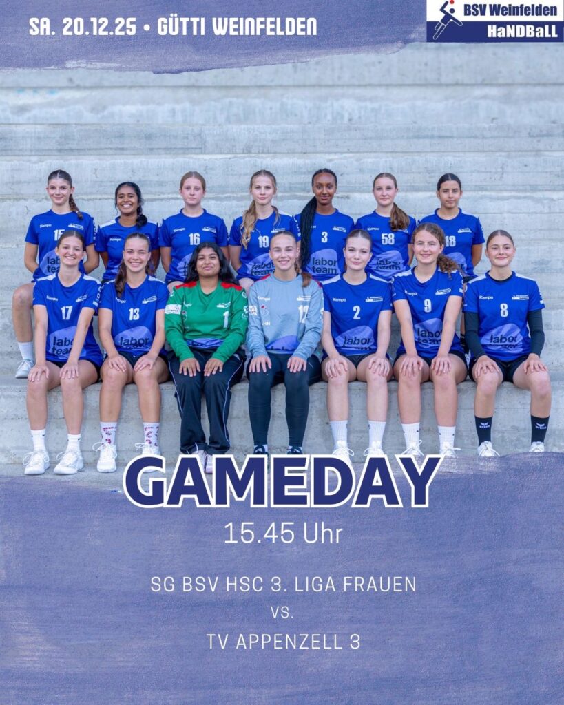 Die SG BSV HSC (3. Liga Frauen) bestreitet am Samstag, 20.12.2025, ihr letztes Heimspiel des Jahres. Anpfiff ist um 15.45 Uhr in der Gütti Weinfelden. ...