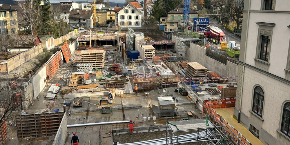 Im Anschluss an die Präsentationen nahm Eva Zellmann, Projektleiterin im Hochbauamt, die Medienschaffenden mit auf einen Rundgang durch die Baustelle Ergänzungsbau Regierungsgebäude. Dieser wurde bislang vor allem als moderner Holzbau propagiert. «Doch es wird auch eine ganze Menge wiederverwerteter Beton eingebaut», betonte Zellmann. Namentlich gilt dies für den Unterlagsbeton der Baugrube, das Fundament sowie die Wände und Decken im dritten und zweiten Untergeschoss. Auf Primärbeton zurückgegriffen wird beispielsweise bei der Einfahrtsrampe. Begründung: Frosttausalzbeständigkeit. So könne letztlich über 50 Prozent mit Recyclingbeton realisiert werden und dies nahezu kostenneutral.