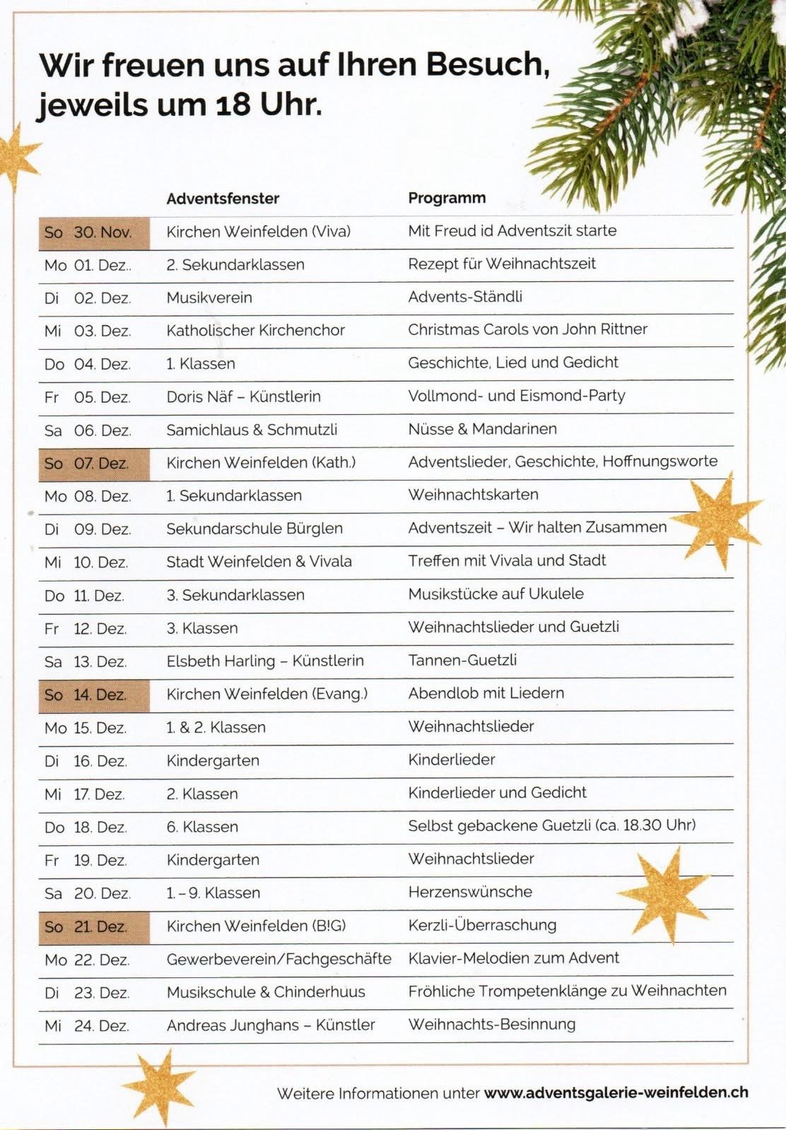 Bis am 24. Dezember wird jeden Abend um 18.00 Uhr auf dem Marktplatz in Weinfelden ein weiteres Bild der «Adventsgalerie Weinfelden» feierlich eröffnet. Die einzelnen Eröffnungen werden von den jeweiligen Bildgestaltenden umrahmt – zum Beispiel mit Musik, Gesang oder besinnlichen Worten.