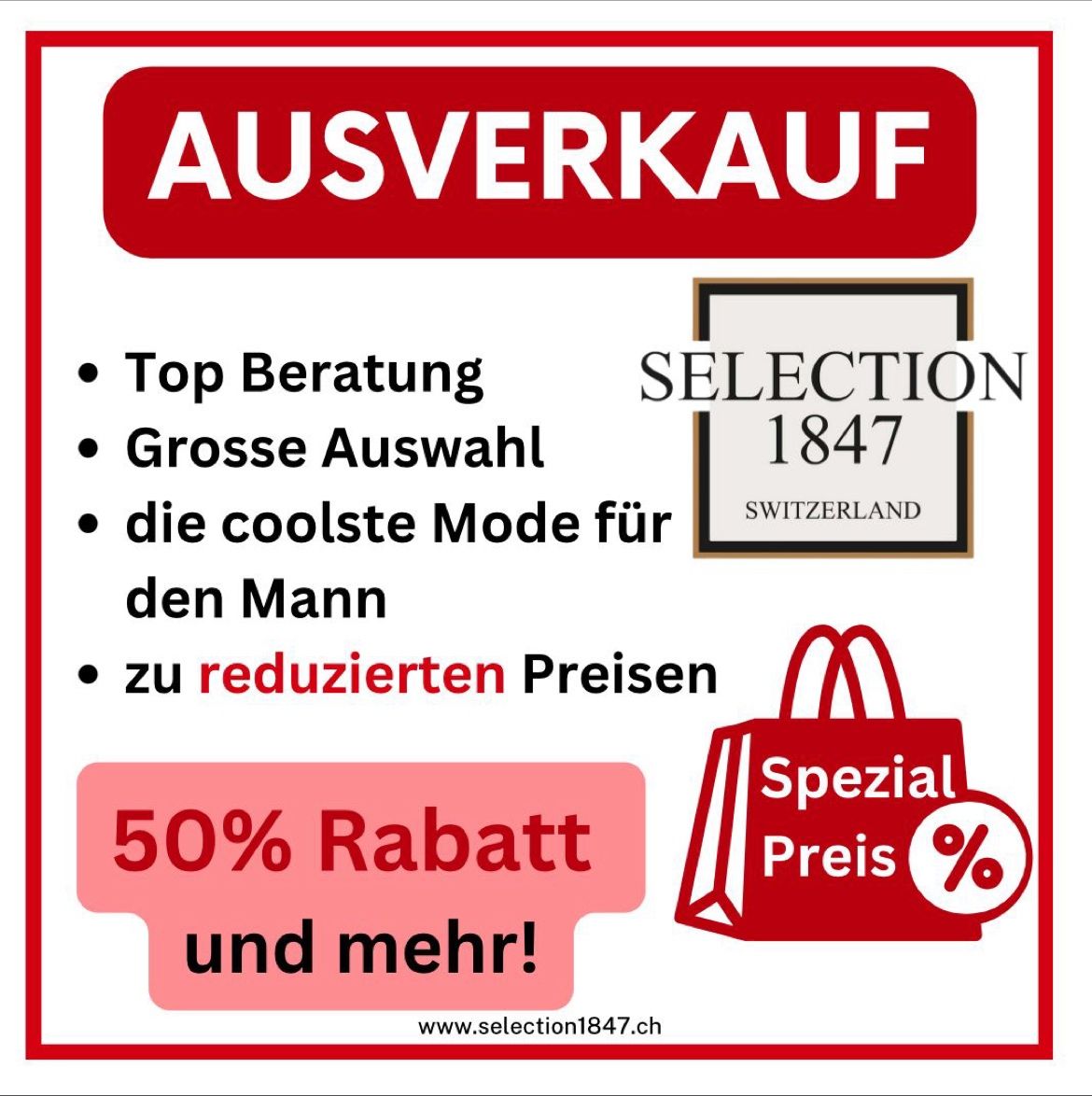 Nach erfolgreichen Jahren des Verkaufs von exklusiver Mode und erstklassiger Beratung gibt Selection 1847 bekannt, dass die Boutique am Samstag, dem 25. Mai 2024, ihre Türen schliessen wird. Das Unternehmen möchte sich bereits heute bei seinen treuen Kunden für das seit 2017 entgegengebrachte Vertrauen bedanken.