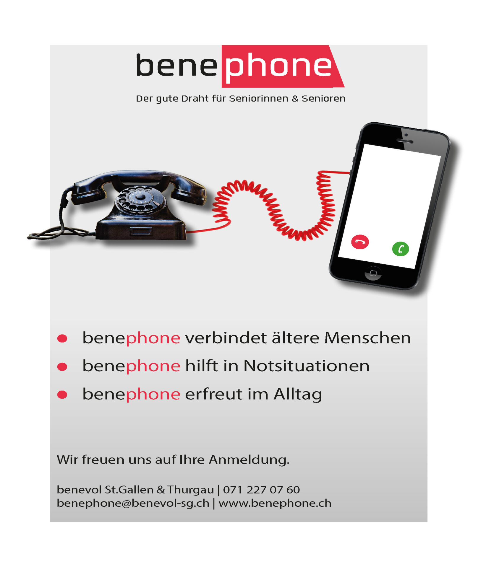 benephone ist ein kostenloses Angebot, das in Zusammenarbeit von benevol St. Gallen und benevol Thurgau angeboten wird. Es fördert den Kontakt und den Austausch mit Menschen, wirkt der Vereinsamung und Isolation entgegen und beschert mehr Freude im Alltag.