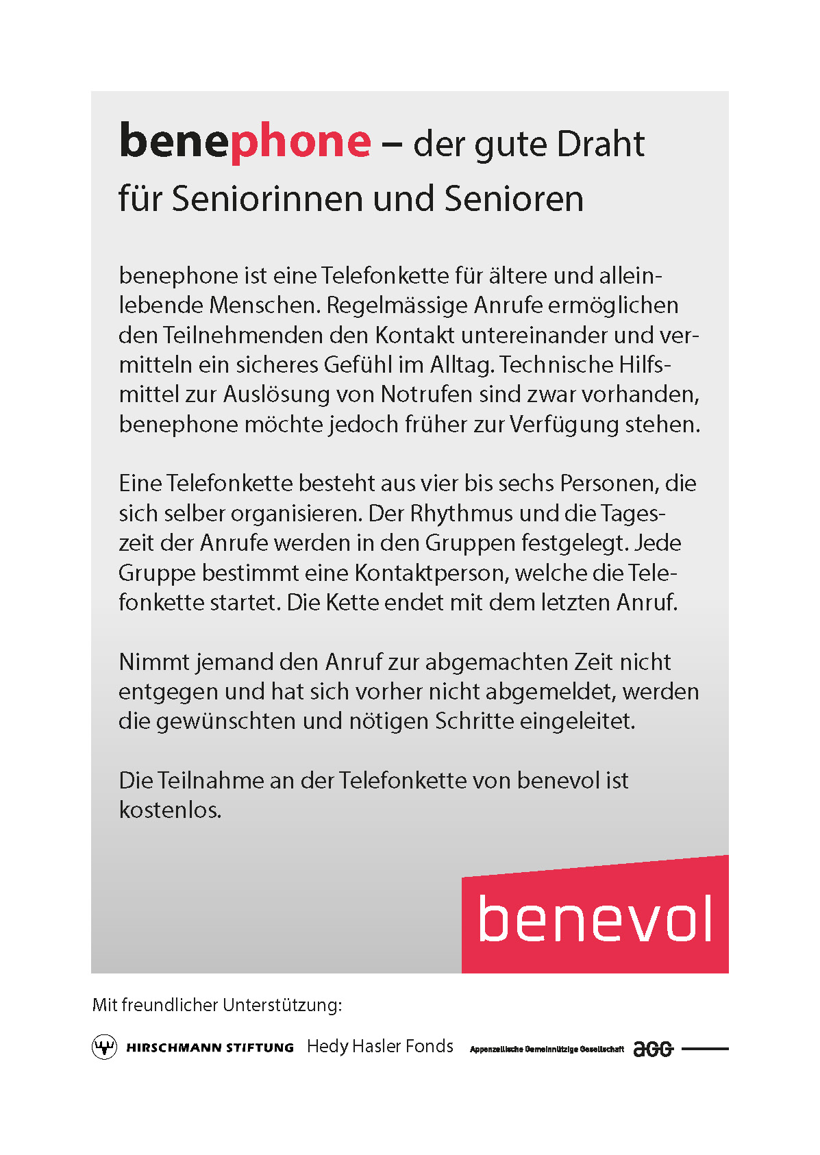 benephone ist eine Telefonkette für ältere und alleinlebende Menschen. Regelmässige Anrufe ermöglichen den Teilnehmenden den Kontakt untereinander und vermitteln ein sicheres Gefühl im Alltag. Eine Telefonkette besteht aus vier bis sechs Personen, die sich selbst organisieren. Der Rhythmus und die Tageszeit der Anrufe werden in den Gruppen festgelegt. Nimmt jemand den Anruf zur abgemachten Zeit nicht entgegen und hat sich vorher nicht abgemeldet, werden die vereinbarten und nötigen Schritte eingeleitet.