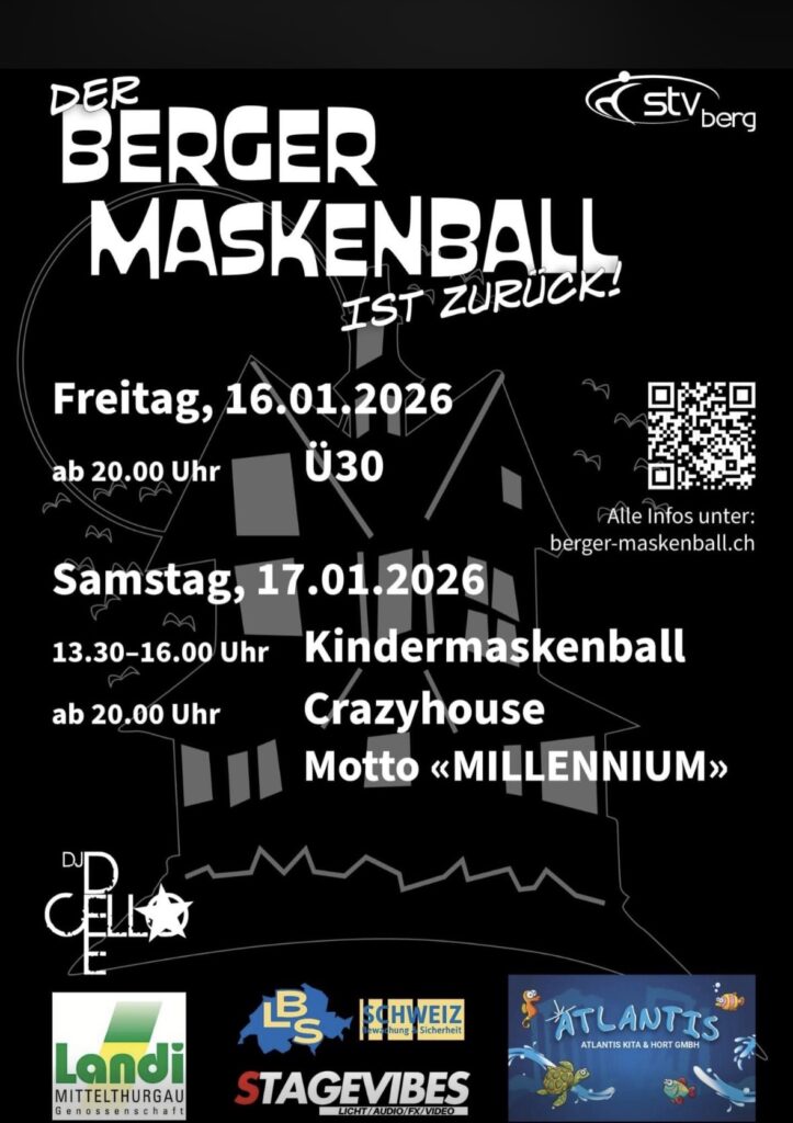 Laut einem Facebook-Beitrag kehrt der «Berger Maskenball» Mitte Januar zurück. Der Anlass findet an zwei Tagen statt: Freitag, 16.01.2026, ab 20.00 Uhr mit einer Ü30-Party. Am Samstag, 17.01.2026, folgt von 13.30 bis 16.00 Uhr ein Kindermaskenball; ab 20.00 Uhr ist «Crazyhouse» angekündigt – Motto «MILLENNIUM».