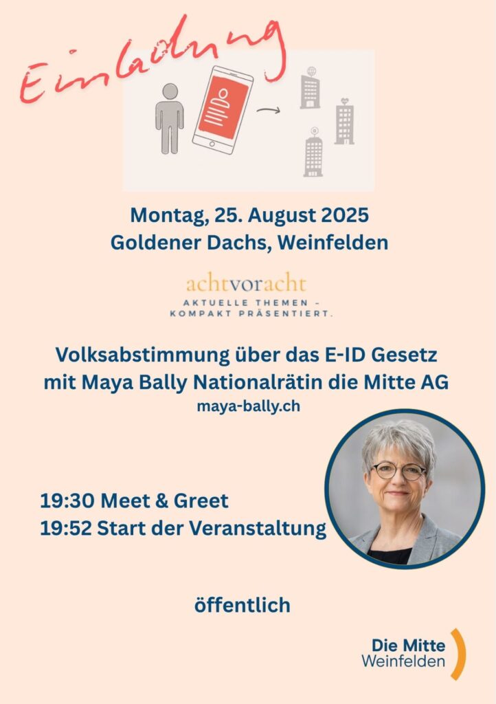 Hand aufs Herz: Sind sie sattelfest, wenn es um die E-ID (elektronische Identitätskarte) geht? Wenn sie die Frage mit Nein beantworten, sind sie in guter Gesellschaft. Die Veranstaltungsreihe 8vor8 behandelt dieses Thema mit einer Fachfrau. Maya Bally ist Nationalrätin der Die Mitte Aargau. Sie gibt einen Überblick, legt Fakten auf den Tisch, zeigt Schwächen und Stärken der Vorlage aber überlässt es am Schluss allen selbständig das Pro und Kontra abzuwägen. Maya Bally hat als Fraktionssprecherin der Mitte das E-ID Geschäft vertreten und ist auch beruflich mit den aktuellen Fragen vertraut. 8vor8 beginnt  am Montag, 25. August um 19.52 Uhr im Goldenen Dachs in Weinfelden. Bereits ab 19.30 Uhr freut sich Maya Bally auf individuelle Gespräche.