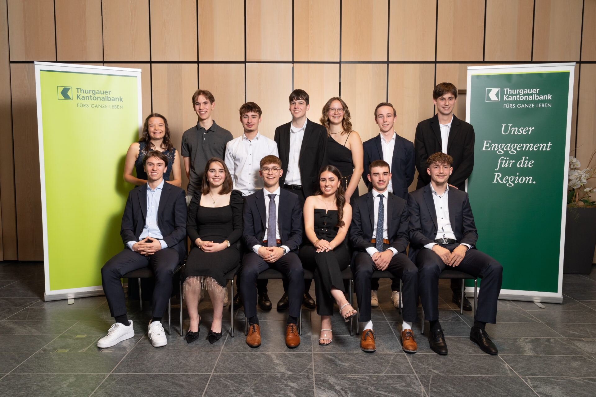 13 Lernende haben ihre Ausbildung bei der TKB erfolgreich abgeschlossen. Hinten, von links: Salome Weber (Diessenhofen), Andrin Schwarz (Frauenfeld/Aadorf), Michael Neuweiler (Kreuzlingen/Ermatingen), Joschua Peter (Amriswil/Bischofszell), Sarah Kundert (Romanshorn), Raphael Rudolf (Frauenfeld/Aadorf), Robin Henle (Koch, Weinfelden). Vorne, von links: Flavio Mammoliti (Kreuzlingen/Ermatingen), Valmira Lutfi (Amriswil/Bischofszell), Matthias Rissi (Weinfelden/Müllheim/Sulgen), Dashurie Dauti (Weinfelden/Müllheim/Sulgen), Janis Kern (Arbon), Noah Signer (Sirnach/Münchwilen).