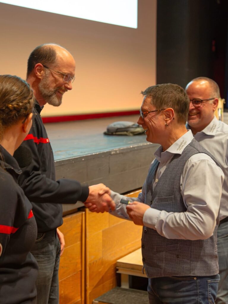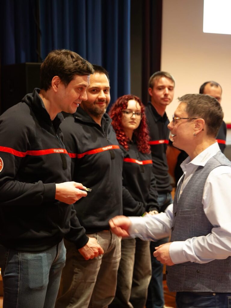 Im Rahmen des Abends wurden zudem sieben Angehoerige befoerdert: Patrick Zickert zum Wachtmeister, David Ammann, Michèle Pargätzi und Friedrich Thöny zum Korporal sowie Etienne Kauth, Fabienne Weibel und Lucien Brechbühl zum Gefreiten. Besonders erfreulich sei zudem, dass die Feuerwehr im Jahr 2025 neun Neueintritte verzeichnen durfte. Abgerundet wurde der Schlussrapport durch ein gemeinsames Essen und geselliges Beisammensein.