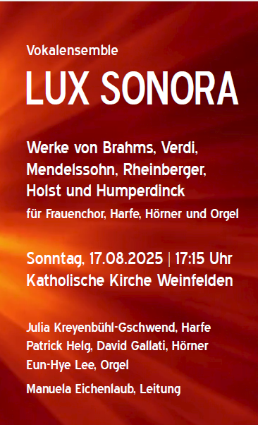 Am Sonntag, 17. August begrüssen wir die Sängerinnen des Projektes LUX SONORA, welche den Gottesdienst um 10 Uhr musikalisch umrahmen und am Nachmittag um 17.15 Uhr ein Konzert geben.