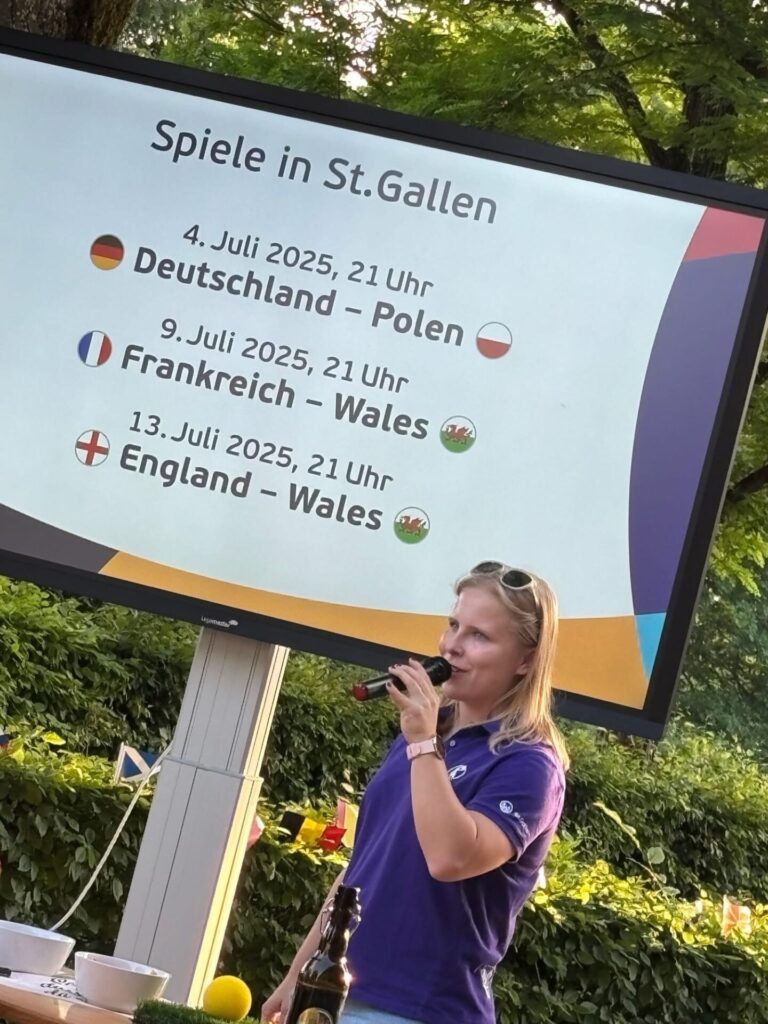 Im Anschluss begrüssten Schulleiter Philipp Frei und TFV-Präsident Patrick Küng als letztes Highlight vom Gipfeltreffen Céline Bradke. Als Projektleiterin der Host City St.Gallen, also einer der acht Austragungsstätten der WEURO, präsentierte Sie spannende Insights und aktuellste News zum bald startenden Fussballhighlight im Sommer. Nebst unterschiedlichen Events in der Stadt berichtete Céline Bradke voller Freude über die grosse Ticketnachfrage. Zwei von drei Spielen in der Arena St. Gallen sind bereits restlos ausverkauft. Die Ostschweiz freut sich klar auf die WEURO!