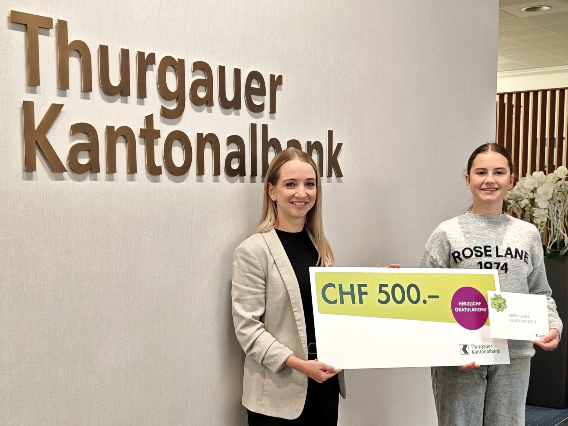 Rahel Pfenniger, Teamleiterin Privatkunden TKB Weinfelden (links), übergibt der Gewinnerin Louisa Haltner den Hauptpreis.