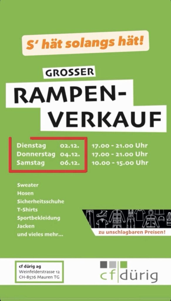S’ hät solangs hät! Die cf dürig ag in Mauren TG lädt Anfang Dezember zum grossen Rampenverkauf ein. An drei Tagen können Kundinnen und Kunden von unschlagbaren Preisen profitieren: