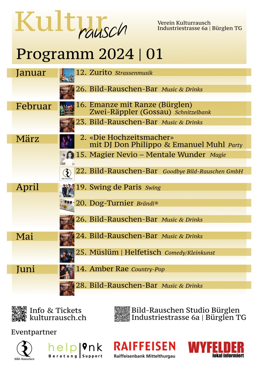 Der Verein Kulturrausch Bürglen hat sich vorgenommen, auch in diesem Jahr wieder mit abwechslungsreichen Veranstaltungen zu begeistern. Notiere dir jetzt schon die Termine und lassen Sie sich in den bunten Reigen der vielseitigen Events entführen.