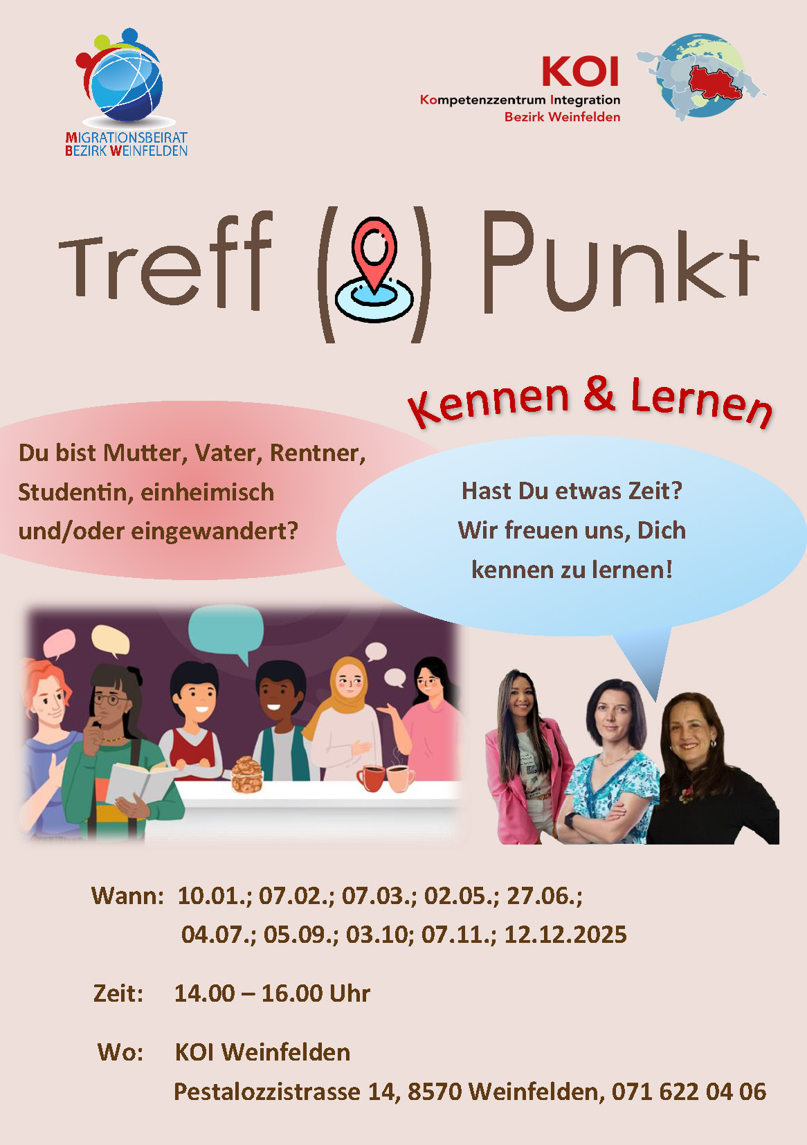 Der «Treff(.)Punkt» findet am Donnerstag, 7. November 2025, von 14.00 bis 16.00 Uhr im Kompetenzzentrum Integration KOI an der Pestalozzistrasse 14 in Weinfelden statt. Menschen unterschiedlichster Herkunft und Sprache kommen hier zusammen, um miteinander ins Gespräch zu kommen, neue Kontakte zu knüpfen und voneinander zu lernen.