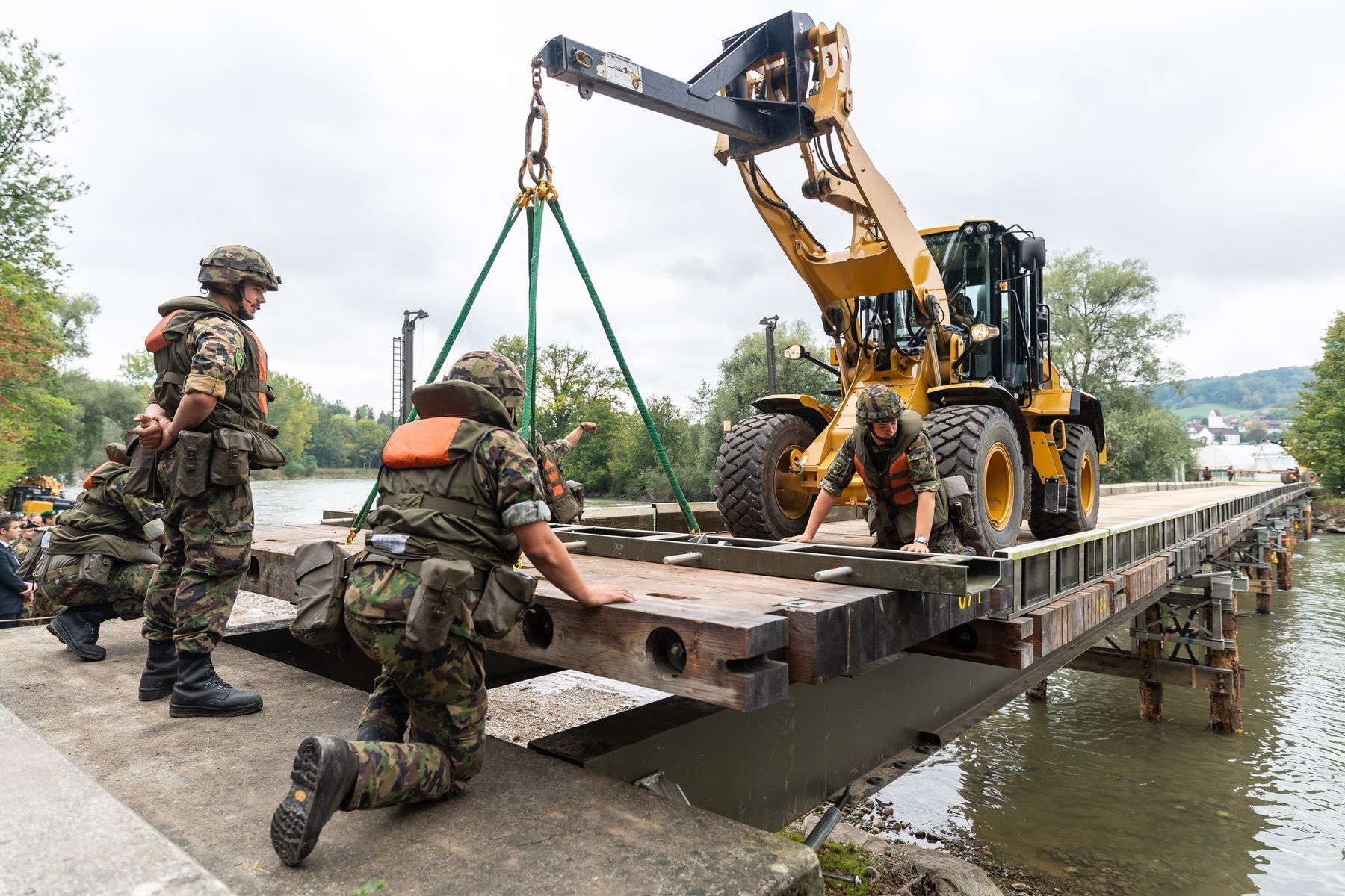 Soldaten beim Erstellen einer Brücke mithilfe eines Radladers (Bild: VBS/DDPS, Alexander Kühni)