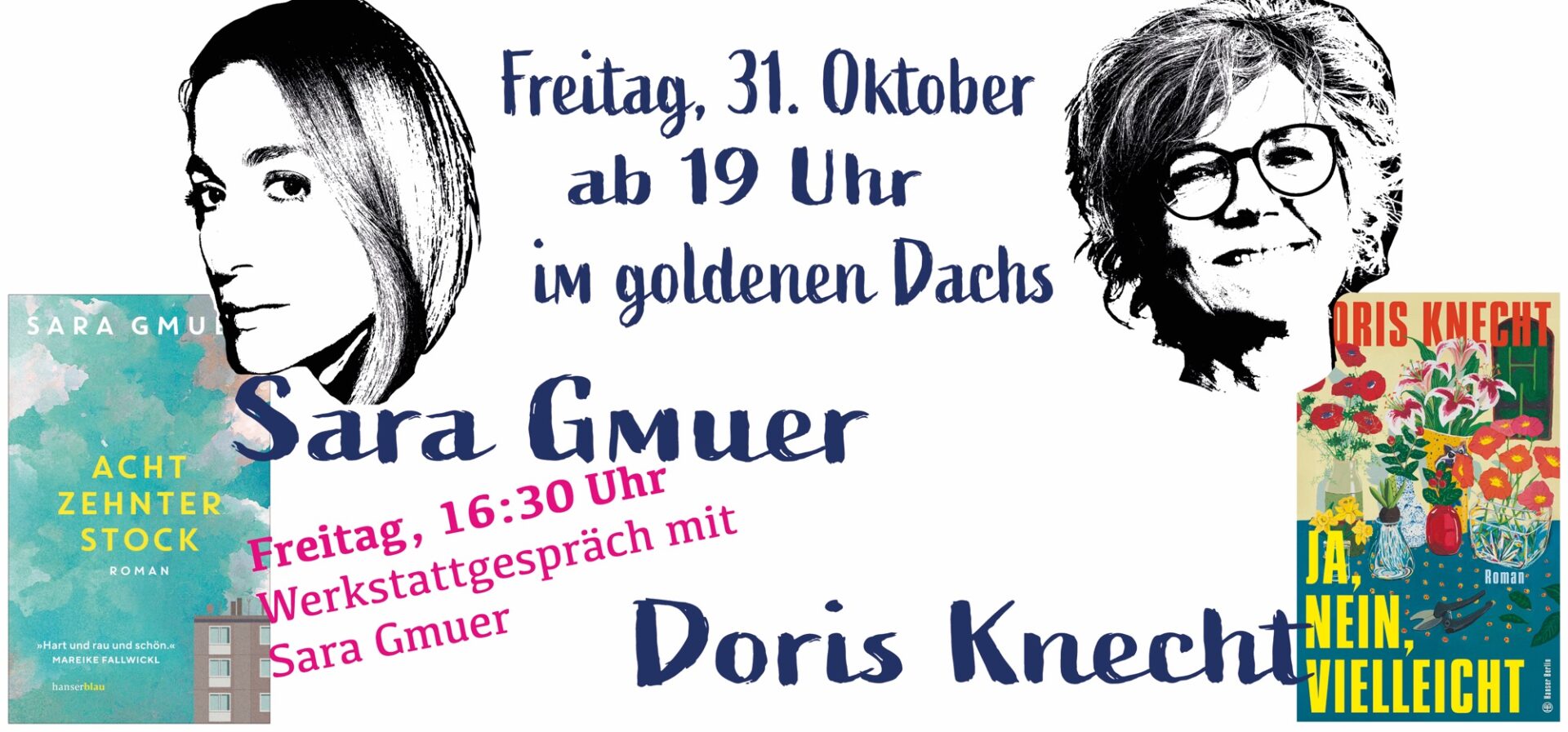 Um 20:30 Uhr beschenkt uns Doris Knecht, die lange als Kolumnistin arbeitete, mit ihrer Lesung über ihren Roman „Ja, nein, vielleicht“. Darin geht es um eine Frau, die denkt, sie hätte mit Liebesgeschichten abgeschlossen, bis sie auf Friedrich trifft, der sie stutzen lässt.