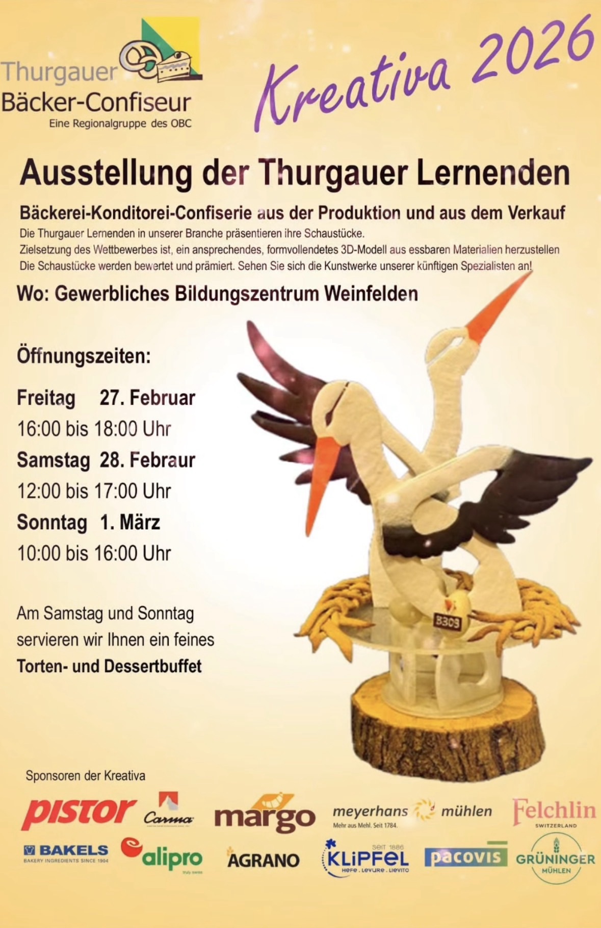 Im Rahmen der «Kreativa 2026» laden die Thurgauer Bäcker-Confiseur zur Ausstellung der Thurgauer Lernenden ein. Gezeigt werden Schaustücke aus der Bäckerei-Konditorei-Confiserie – sowohl aus der Produktion als auch aus dem Verkauf. Ziel des Wettbewerbs ist es, ein ansprechendes, formvollendetes 3D-Modell aus essbaren Materialien zu gestalten. Die Arbeiten werden bewertet und prämiert.