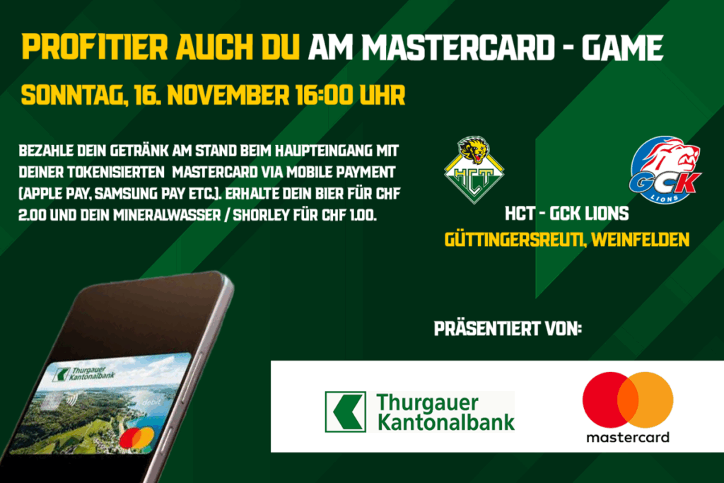 Bezahle dein Getränk (Bier, Mineralwasser oder Shorley) mit deiner tokenisierten Debit Mastercard via Mobile Payment (Apple Pay, Samsung Pay etc.) und erhalte CHF 3.00 – CHF 4.00 Rabatt. Einfach mobil bezahlen, sparen und den HC Thurgau unterstützen – so macht Anfeuern noch mehr Freude!