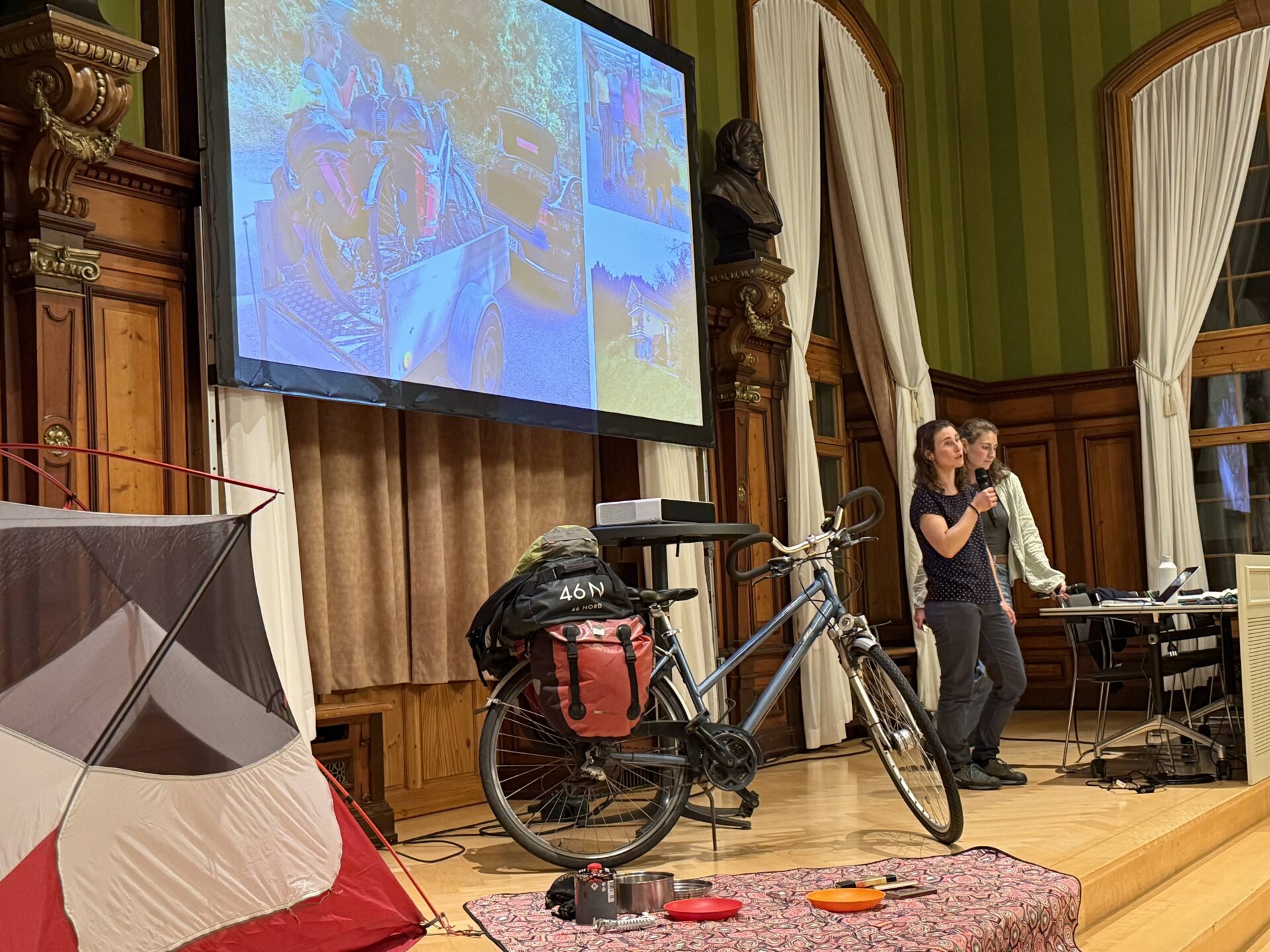 Mit eindrücklichen Fotos, persönlichen Geschichten und viel Charme erzählten die beiden Weinfelderinnen von ihren mehrmonatigen Veloreisen – zuerst von der Schweiz bis nach Albanien, später durch den Norden Europas. Auf der Bühne präsentierten sie nicht nur ihre Erlebnisse, sondern auch ihre mitgeführten Fahrräder, das Zelt und Ausrüstungsgegenstände, die unterwegs unverzichtbar waren.