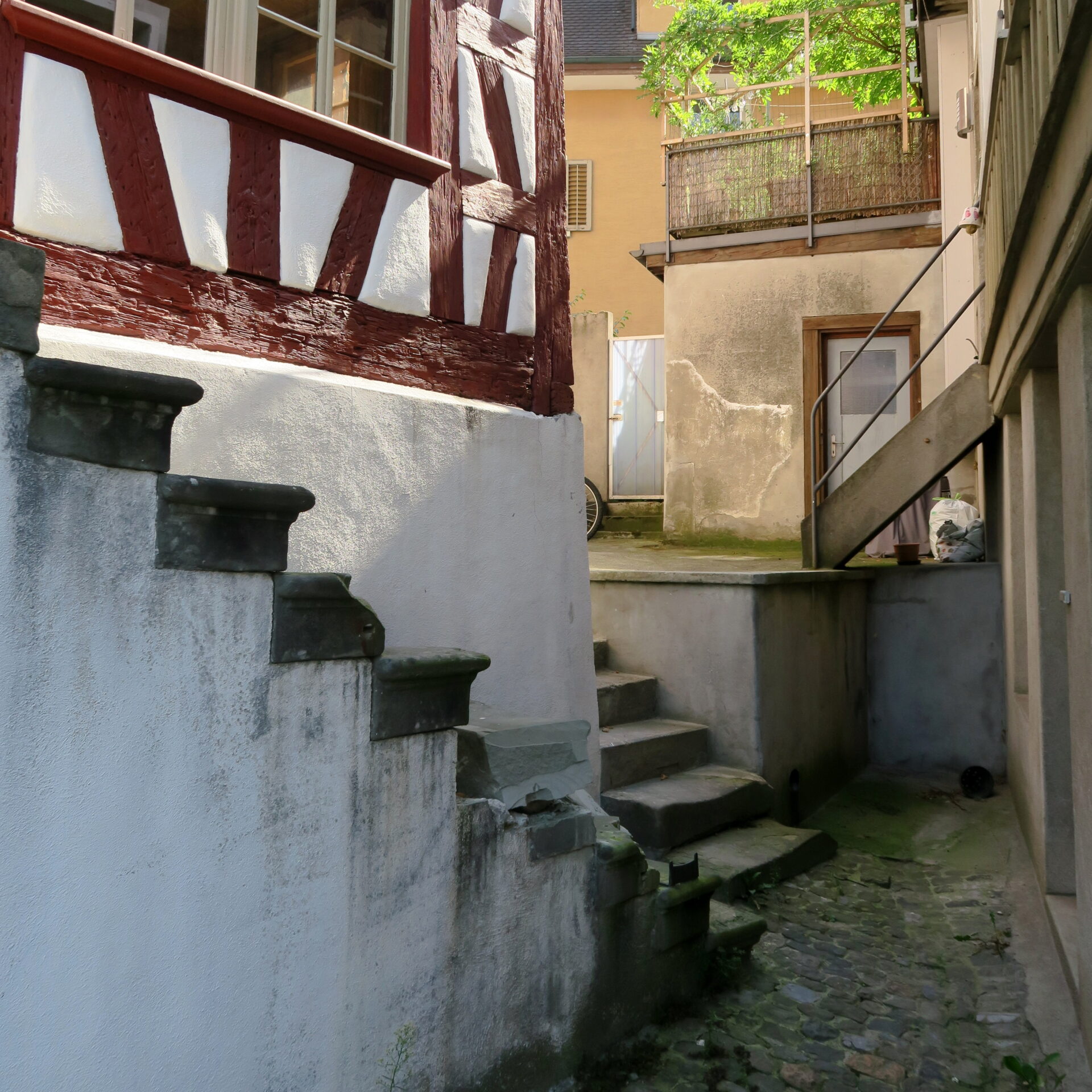 Die Selbstverständlichkeit, mit der wir heute unser immer verfügbares und sauberes Wasser nutzen, ist historisch gesehen eine vergleichsweise neue Erscheinung. Bis ins frühe 20. Jahrhundert war die Wasserversorgung in Weinfelden ein ständiges Problem. Quellen am Ottenberg speisten zahlreiche öffentliche Brunnen. Hier traf man sich zur Versorgung des Haushalts, und am Trog war gleichzeitig auch Wasch- und Schwatzplatz. Das Leben der Menschen spielte sich früher auf viel dichterem Raum ab. Nicht nur lebten sie in den Häusern enger zusammen als heute. Viele von ihnen übten auch am Wohnort ihr Handwerk oder Gewerbe aus, und daneben betrieben sie meist eine kleine Landwirtschaft. Das traf auch auf den Pfarrer, Lehrer, Apotheker oder Eisenhändler zu. Diese Art zu leben bewirkte, dass auch der Umgebungsraum der Häuser oft verschachtelt und vielfältig genutzt war. Erstaunlich viel ist davon erhalten und auffindbar geblieben, auch wenn wir es manchmal erst auf den zweiten Blick sehen. Hinter den Häusern der Weinfelder Bürger und Handwerker entdecken wir bis heute ihre Höfe und Gärten. Im Hof übten sie ihr Gewerbe aus und stapelten ihre Handelswaren. Und in den anschliessenden Gärten pflegten sie kleine Felder oder hielten ein wenig Vieh, um einen Beitrag zur Ernährung der Familie zu leisten.