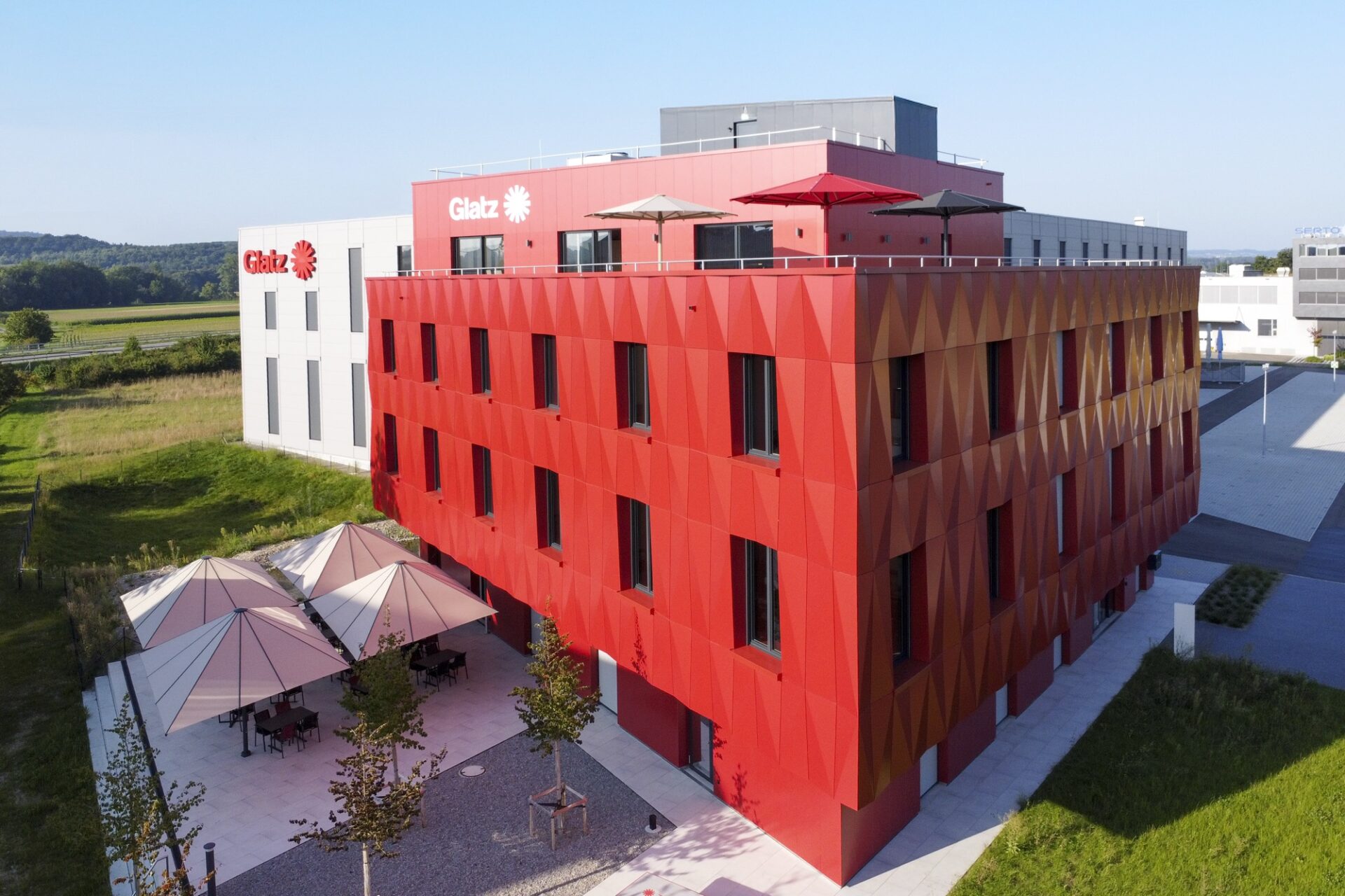 Der Neubau der Glatz AG im Norden von Frauenfeld ist dank der Fassade in der Firmenfarbe gut erkennbar.