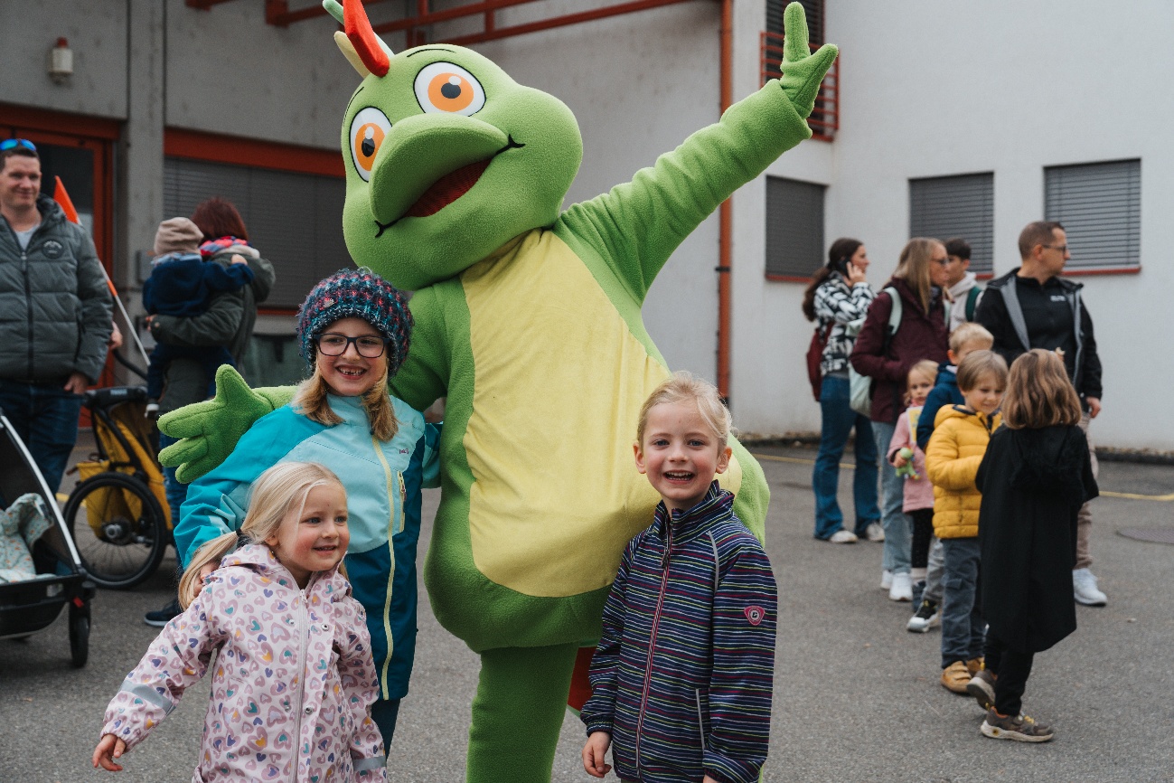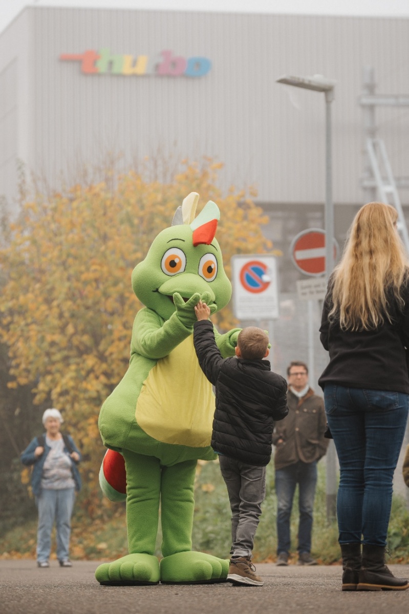 Thurbi, das Maskottchen der Regionalbahn, begrüsst die Menschen zum Tag der offenen Tür.