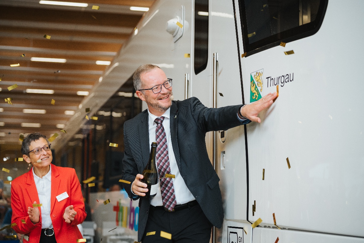 Regierungsrat Walter Schönholzer tauft den ersten Flirt Evo von Thurbo auf den Namen «Thurgau».