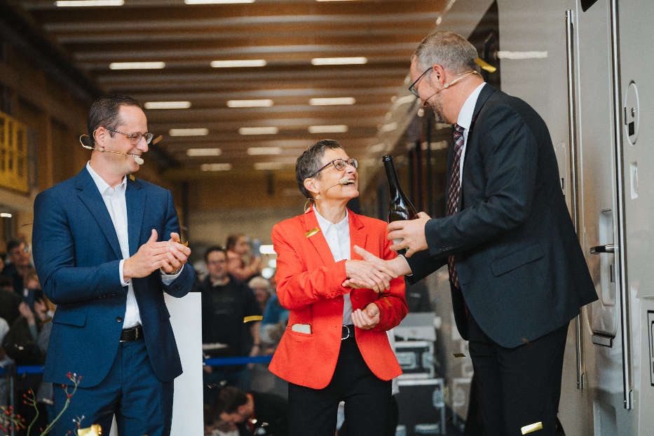 Lucius Gehrig, Divisionsleiter Schweiz bei Stadler; Claudia Bossert, Thurbo Unternehmensleiterin und der Thurgauer Regierungsrat Walter Schönholzer strahlen bei der Taufe des ersten Flirt Evo von Thurbo um die Wette.
