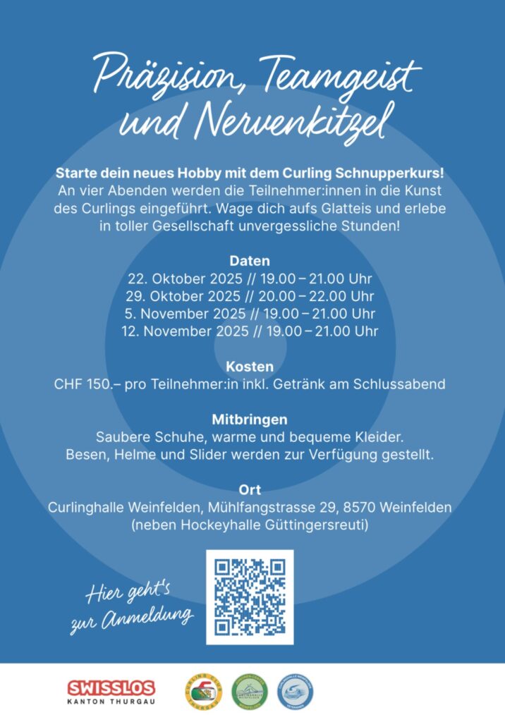 Starte dein neues Hobby mit dem Curling Schnupperkurs! Erfahrene Instruktoren zeigen dir, wie du sicher über das Eis gleitest. An vier Abenden werden die Teilnehmer:innen in die Kunst des Curlings eingeführt. Wage dich aufs Glatteis und erlebe in toller Gesellschaft unvergessliche Stunden!
