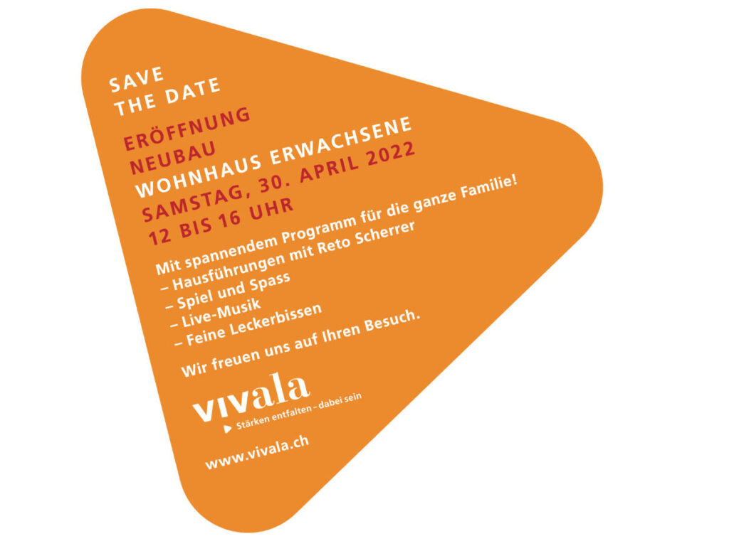 Die Stiftung Vivala in Weinfelden feiert die Eröffnung des neuen Wohnhauses mit einem Tag der offenen Tür: Am 30. April 2022, 12 bis 16 Uhr, ist die Bevölkerung eingeladen, den Neubau zu besichtigen. Dabei führt der beliebte Moderator Reto Scherrer durch die Räume. Auch sonst bietet das Eröffnungsfest ein attraktives Programm für die ganze Familie.