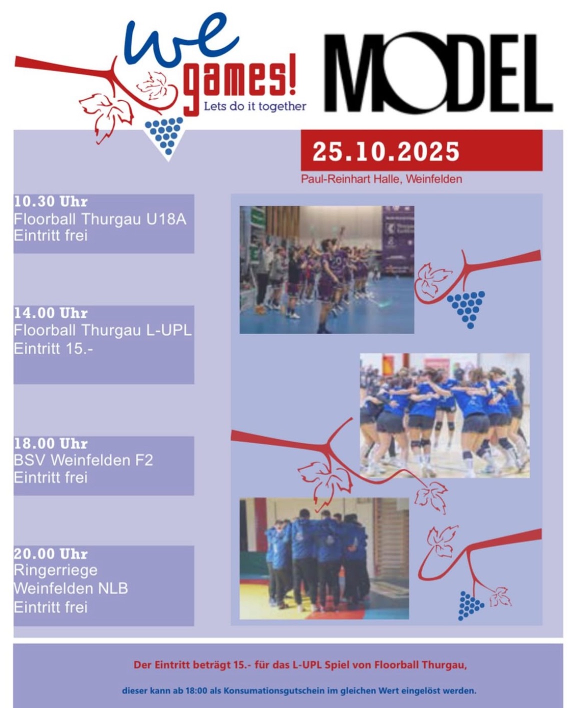 14.00 Uhr: Floorball Thurgau L-UPL (Eintritt 15 Franken, einlösbar als Konsumationsgutschein)