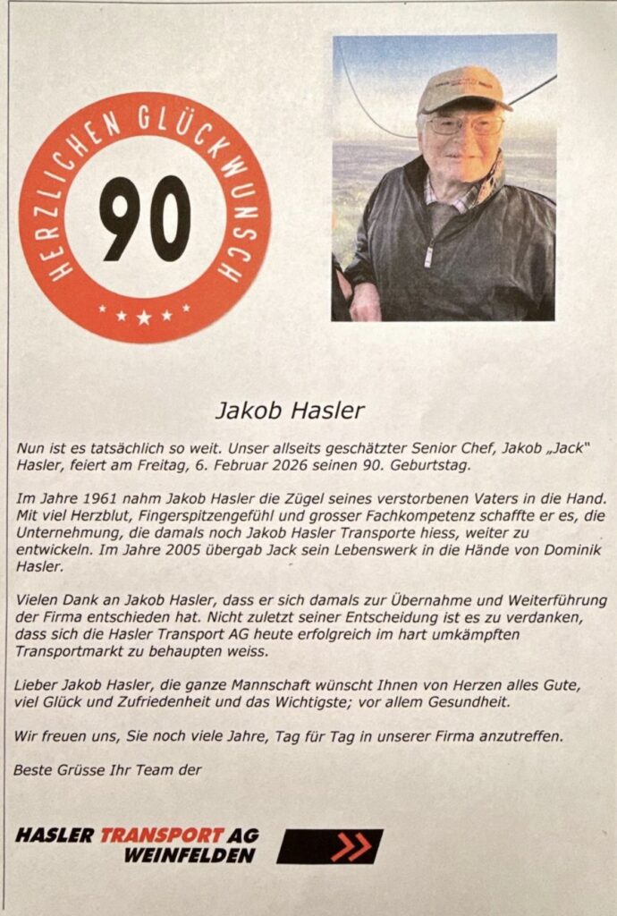 Jakob «Jack» Hasler, langjähriger Unternehmer und Senior Chef der Hasler Transport AG in Weinfelden, wird am Freitag, 6. Februar 2026, 90 Jahre alt. Wie das Unternehmen mitteilt, übernahm Hasler im Jahr 1961 nach dem Tod seines Vaters die Verantwortung für den damaligen Familienbetrieb «Jakob Hasler Transporte» und entwickelte ihn mit viel Herzblut, Fingerspitzengefühl und fachlicher Kompetenz weiter.