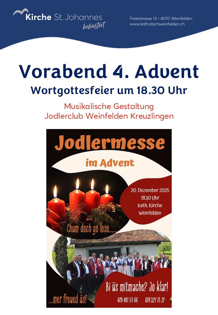 Vom Schweizer Brauchtum zum Weltkulturerbe: Das Jodeln ist von der Unesco in die Repräsentative Liste des immateriellen Kulturerbes der Menschheit aufgenommen worden. Der Jodelclub Weinfelden/Kreuzlingen singt im Vorabendgottesdienst zum 4. Advent. In der Feier hören wir die berührende Begegnung von zwei Frauen. Maria und Elisabeth sind beide schwanger. Elisabeth wird die Mutter von Johannes, Maria von Jesus. Und Jahre später treffen sich beide am Jordan – und Johannes tauft Jesus. Die traditionellen Jodler geben diesem Gottesdienst einen würdigen Rahmen.