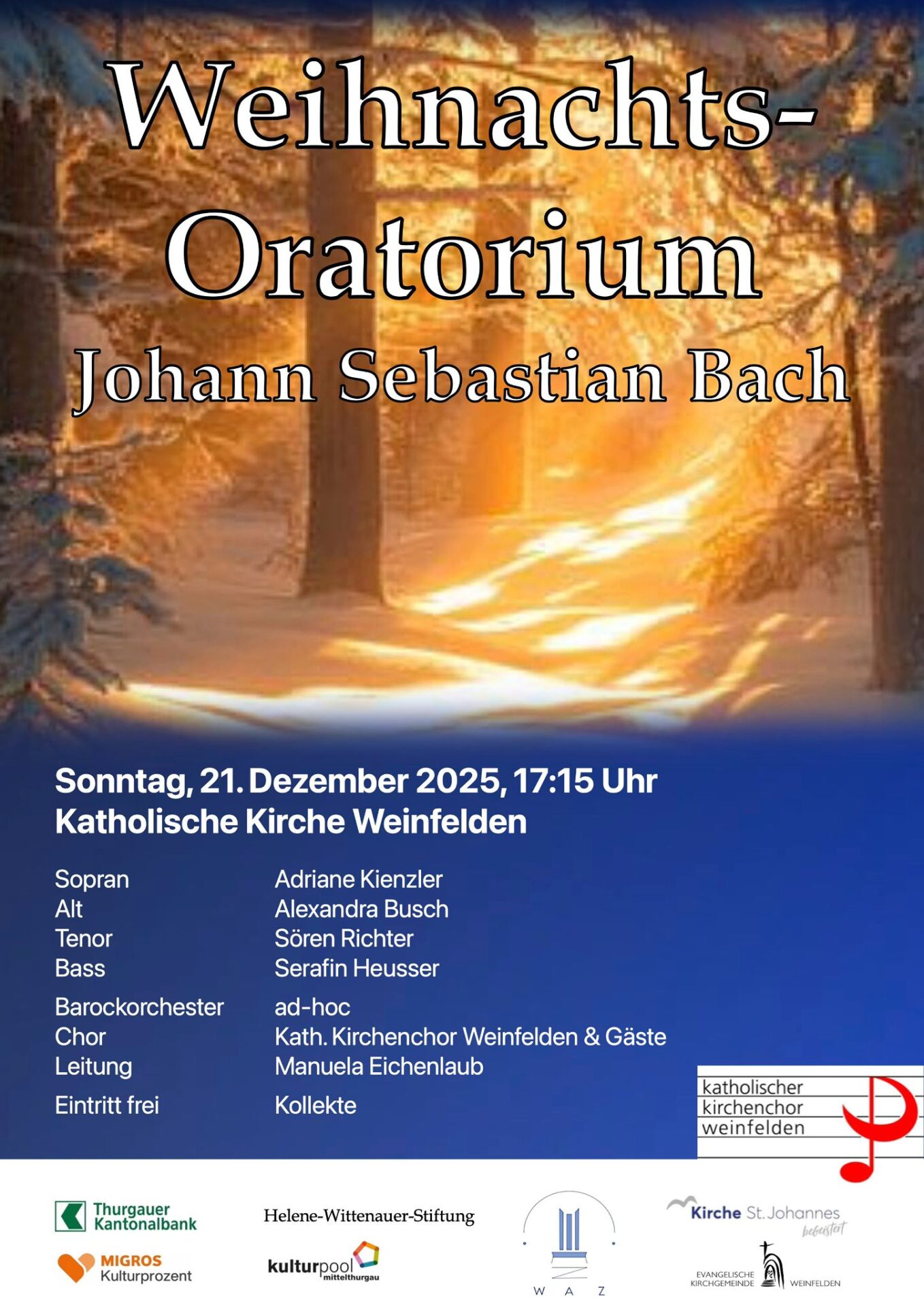 Solisten sind Adriane Kienzler, Sopran; Alexandra Busch, Alt; Sören Richter, Tenor und Serafin Heusser, Bass.
