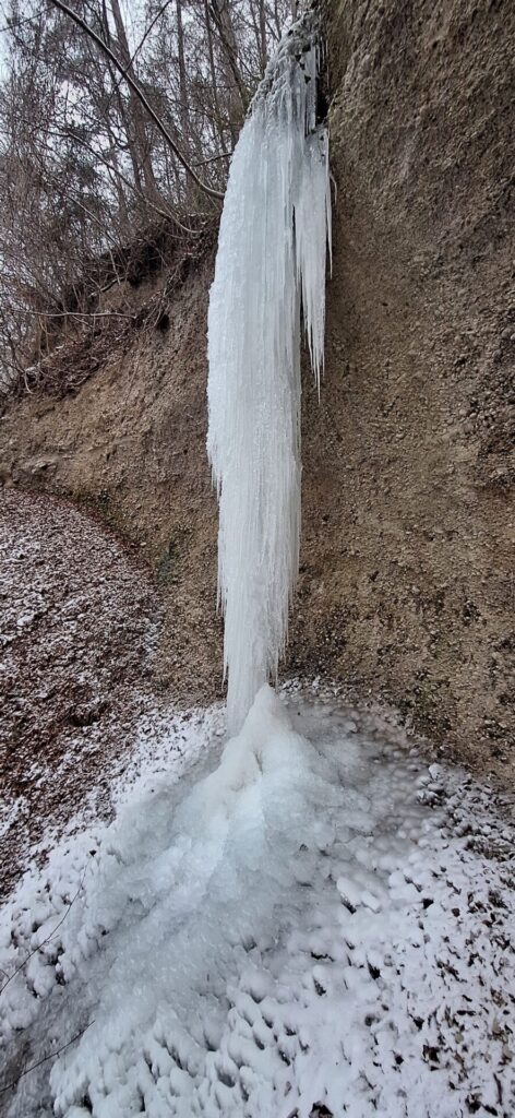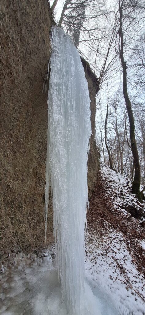 Nahe beim Schloss Weinfelden zeigt der Winter derzeit eine besonders eindrückliche Seite: Im «Chueloch» hat sich ein imposanter Eisfall gebildet, der durch seine Struktur und Dimensionen beeindruckt. Wo sonst Wasser fliesst, haben die anhaltenden Minustemperaturen eine stille, fast skulpturale Eislandschaft entstehen lassen.